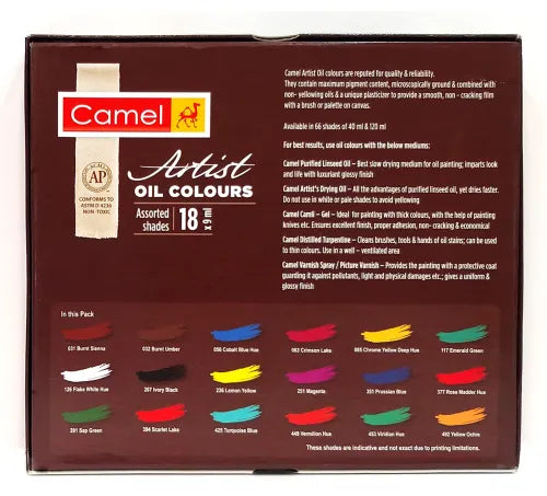 Camel Artists' Oil Colours are reputed for purity, quality and reliability. They contain the maximum pigment content, microscopically ground and combined with non-yellowing oils and a unique plasticizer to give a smooth, non-cracking film with brush or knife on canvas. They are available in 67 brilliant shades. All shades are available in 20 ml,